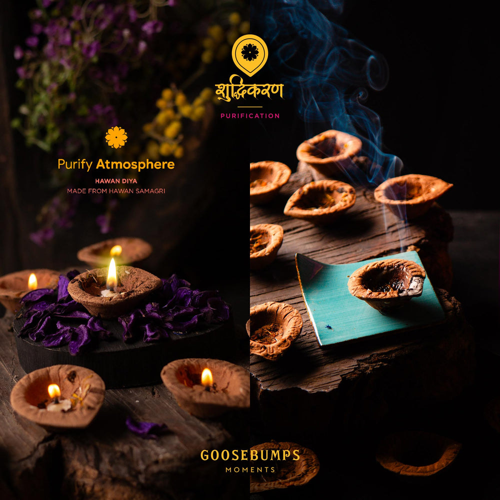 Purify the atmosphere, mind and body with an enriching experience of Goosebumps Shudhikaran Kit. Illuminate your sacred space with our exquisite Diya handcrafted from the purest Hawan Samagri - Cow Dung, Herbs, Flowers & Spices. This beautifully designed Diya not only adds a spiritual ambiance to your home but also embodies the essence of Indian traditions and rituals.