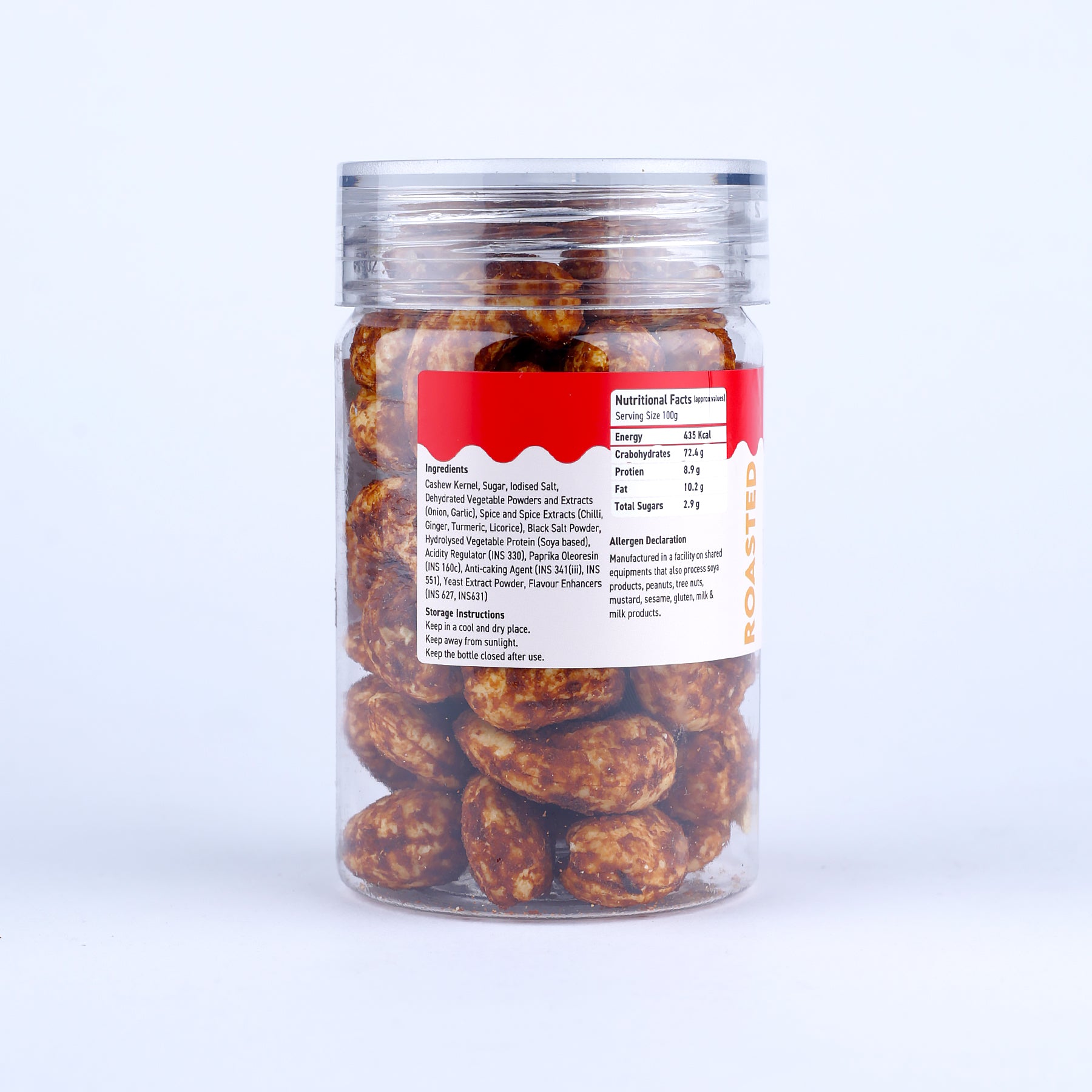 Cashew Kernels (95%), Spices (5%) {Ground Spices & Condiments (Garlic, Chili, Onion), Iodised Salt, Sugar, Hydrolysed vegetable Protein(Soya) Acidity Regulator (INS 330), Vinegar Powder, Natural & Nature Identical Flavouring Substances, Lemon Juice Powder, Anti-caking Agent (E551)}