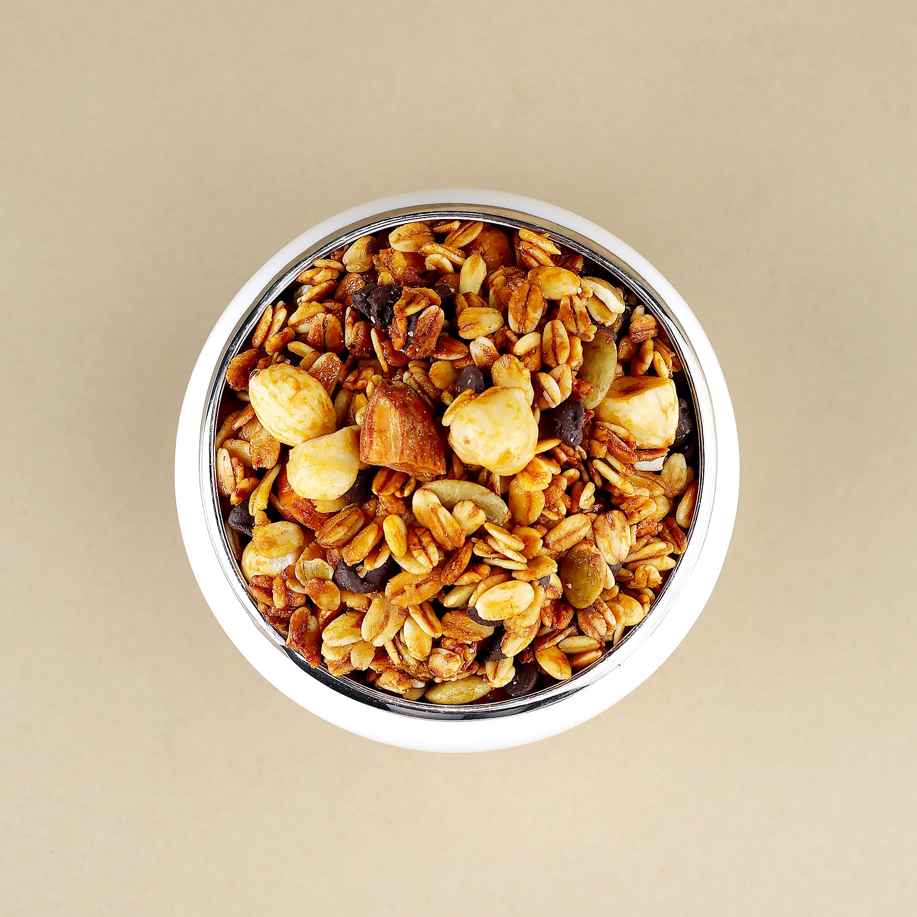 Rolled oats, Pumpkin seeds, Watermelon seeds, Hazelnuts, Almonds, Jaggery, Maple syrup, Orange juice concentrate, Coconut oil, Dark choco chips, Rock salt.